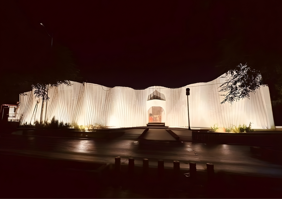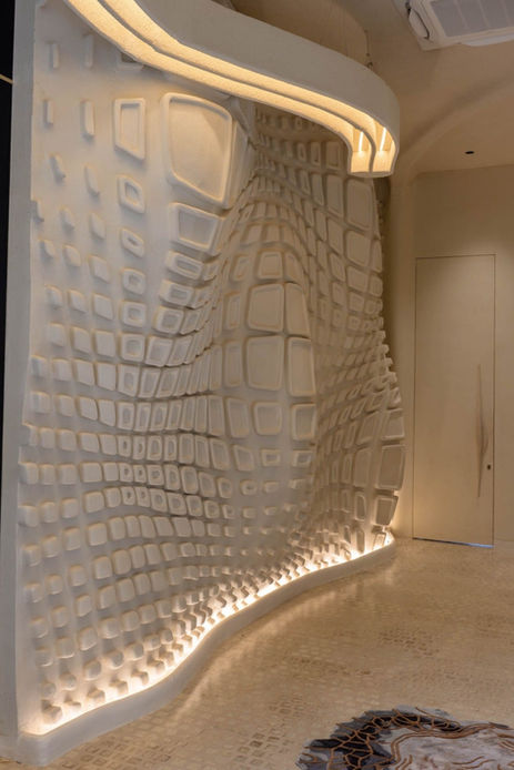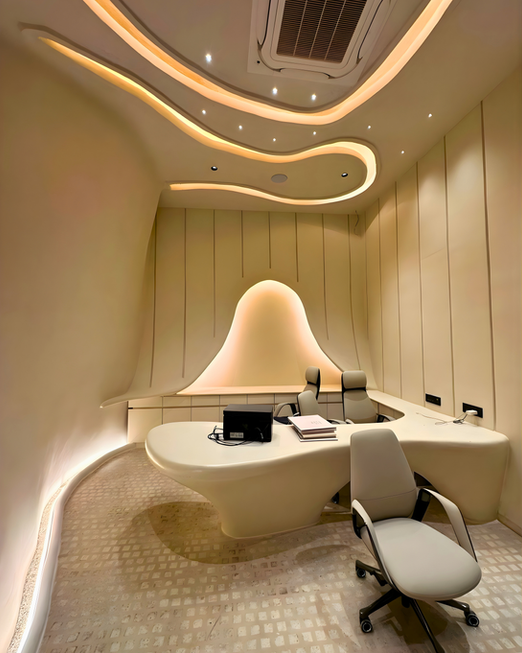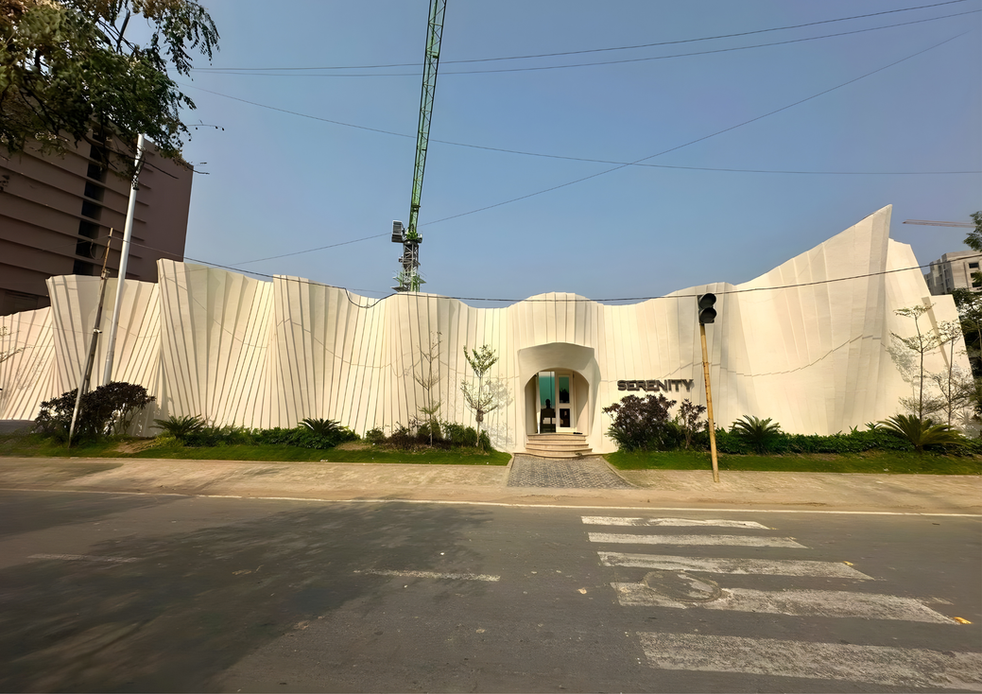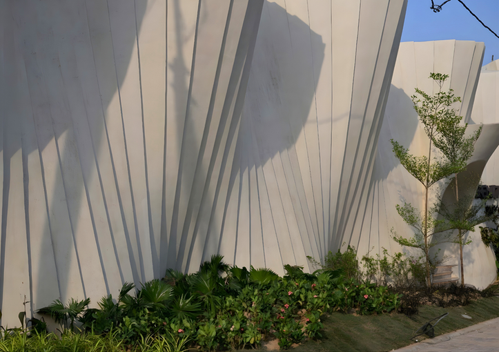 The mega structure, inspired by a unique parametric structure system, features a futuristic facade with a wave frequency layout, utilizing FEFS® core cell membrane structure for homogeneous design. The comprehensive scope of work mandates us to be responsible for providing the complete structural analysis & all the working drawings for the designated structure. Following the design approval, we’ve undertaken the supply of material, fabrication & erection of an MS (Mild Steel) Structure, which includes utilizing all the necessary consumables & applying a protective anti-corrosive paint. The execution of the project involved brainstorming and structural analysis to create a geometrical helical open hyperboloid sheet made from FEFS® core membrane structure. Internal tensile members were planned, and elevational variations were achieved using Malleable Foam concrete FEFS® and projected fixed furniture. Floor used was a UHPC jointless terrazzo called FlexSazzo in interior areas & Paver blocks on exterior pathways. The projected hung canopy was an ideal example of a suitable conjunction of two shapes, yet enhancing the total structure.